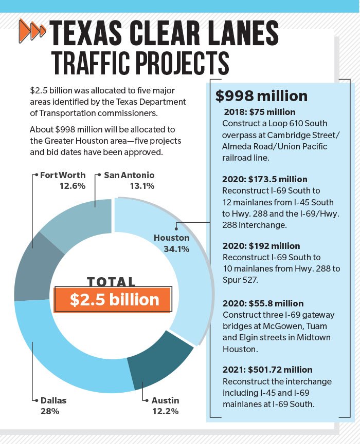 Under the Clear Lanes initiative already underway and previously funded, the reconstruction of the Loop 610/I-69 interchange is estimated to start this summer. The project is estimated to be complete in spring 2022.